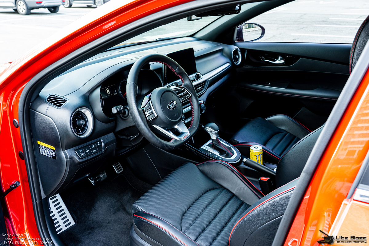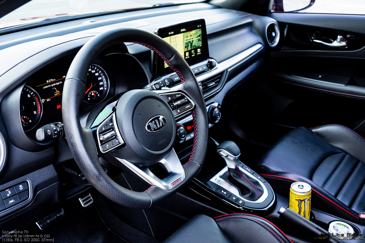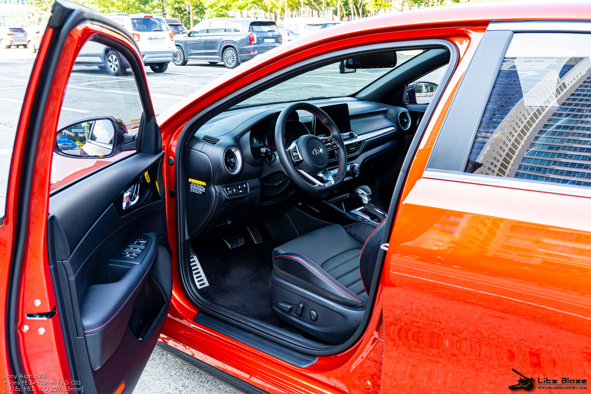 실내의 레이아웃을 비롯한 세부 구성요소는 기본형 K3와 대부분을 공유합니다. 센터페시아가 좌우대칭인 것 같지만 실제로는 사진에서 보시다시피 운전석 방향으로 약간 기울어져 있습니다. 얇고 심플하게 디자인한 구성요소들과 크래시패드를 길게 가로지르는 가니쉬 구성을 보면 BMW의 1시리즈, 3시리즈와 상당히 유사하다는 느낌을 받게 됩니다.