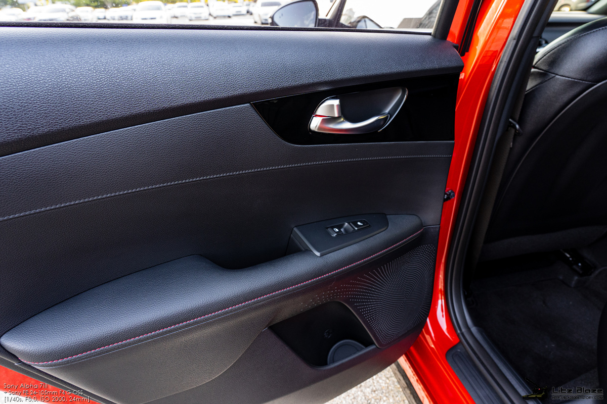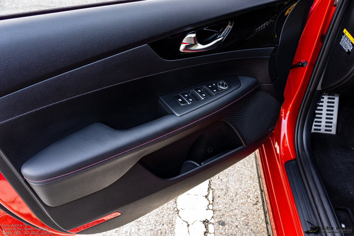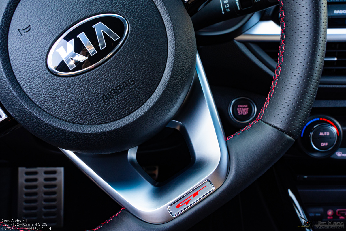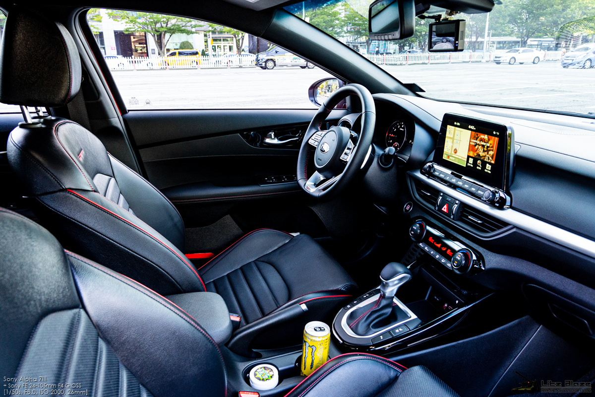실내의 레이아웃을 비롯한 세부 구성요소는 기본형 K3와 대부분을 공유합니다. 센터페시아가 좌우대칭인 것 같지만 실제로는 사진에서 보시다시피 운전석 방향으로 약간 기울어져 있습니다. 얇고 심플하게 디자인한 구성요소들과 크래시패드를 길게 가로지르는 가니쉬 구성을 보면 BMW의 1시리즈, 3시리즈와 상당히 유사하다는 느낌을 받게 됩니다.