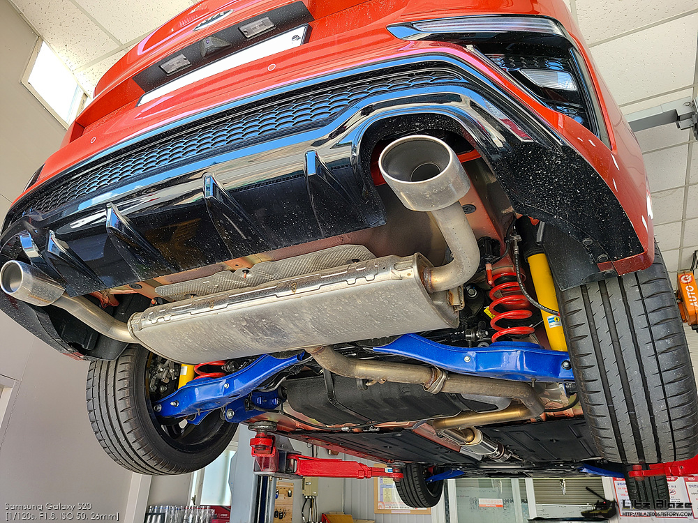 그건 그렇고 서스펜션이 심히 컬러풀한데 이는 튜온 퍼포먼스 패키지 1을 선택한 결과물입니다. 튜온 퍼포먼스 패키지 1(이하 '튜온 서스펜션')을 선택하면 빌스타인의 대표적인 역립식 모노튜브 쇼크업소버인 B8 스프린트가 적용되고 여기에 스프링 강성이 증가한 로워링 스프링이 매칭됩니다. 그리고 스테빌라이저 바의 강성 또한 한층 더 강해지며 로워 암, 트레일링 암, 어시스트 암의 부시가 듀얼 컴파운드 사양의 강화 부시로 변경됩니다. 컨트롤 암 세트가 파란색으로 도색되어 있는데 각각의 컨트롤 암에 부착된 부시만 변경되었을 뿐 컨트롤 암의 재질이 변경된 것은 아닙니다.