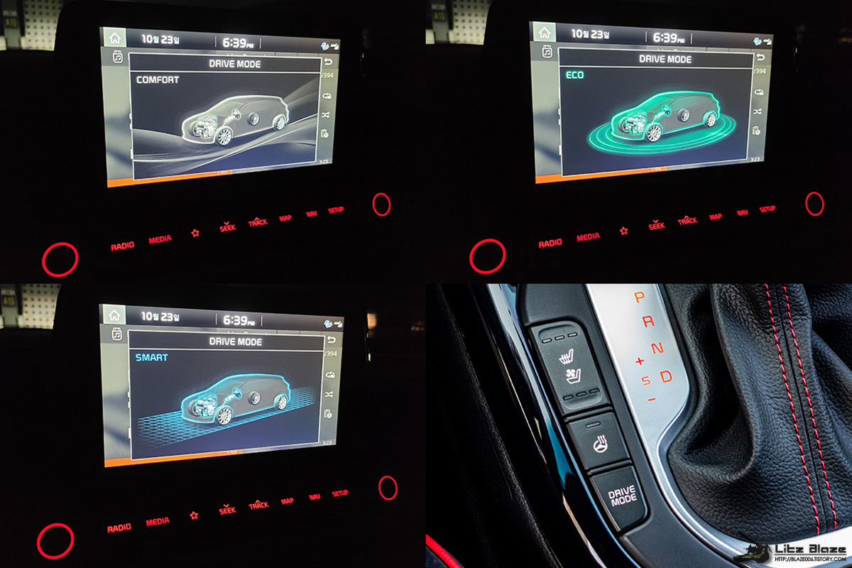 모드 변경은 변속 레버 왼쪽에 위치한 드라이브 모드 버튼을 사용합니다. 그런데 이 버튼으로는 스포츠 모드를 선택할 수 없습니다. 그래서인지 렌터카로 이 차를 접한 사람이 K3 GT에는 스포츠 모드가 없다고 말한 후기를 본 적이 있습니다. 그래서 스포츠 모드로 바꾸려면 뭘 눌러야 하냐면 말이죠...