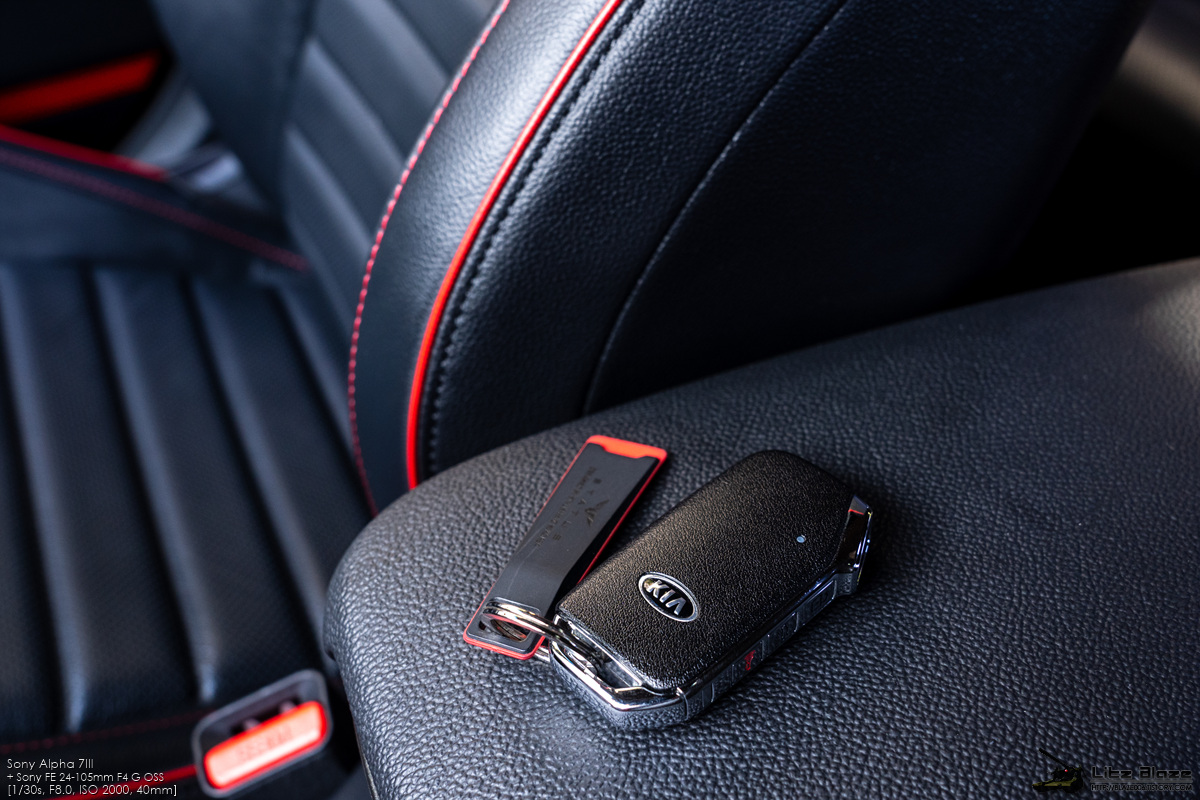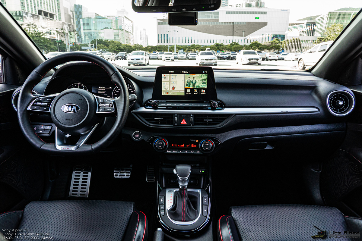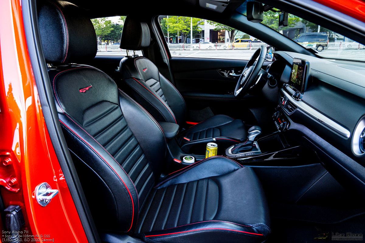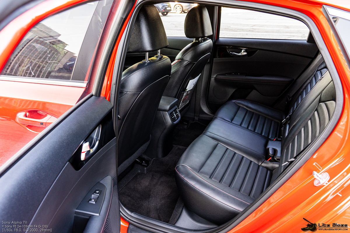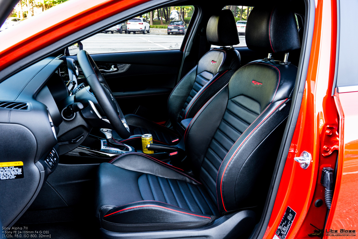 1열 도어를 열면 레드 스티치로 장식된 GT 전용 가죽시트가 가장 먼저 눈에 띕니다. 기아는 이를 튜블러 시트라고 명명했는데 사이드 볼스터와 쿠션 볼스터를 두툼하고 단단하게 만들어 신체를 시트에 고정하는 버켓 시트 수준까지는 아닐지라도 급격한 코너링에서 허리와 허벅지를 지탱해주는 역할을 합니다. 좀 무리하게 꺾었다 싶어도 운전 자세를 무너뜨리지 않게 잡아주기 때문에 본격적인 스포츠 드라이빙에 큰 도움을 줍니다.