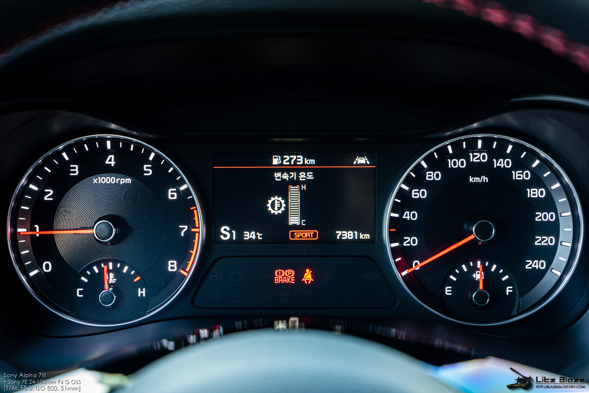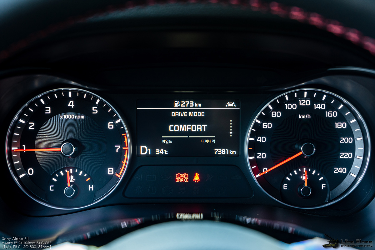 계기판은 기본형 K3와 동일합니다. 개인적으로 이 차의 실내에서 가장 큰 불만이 있다면 바로 이 계기판인데 명색이 고성능 트림이면서 고성능으로서의 어필을 전혀 하지 못하고 있습니다. 요즘 유행하는 풀 LCD 클러스터는 어차피 제 취향이 아니라 아날로그 계기판인 것 자체는 불만이 없는데 고성능 모델로서의 감성적인 요소가 꽝입니다.