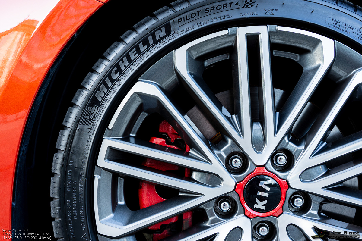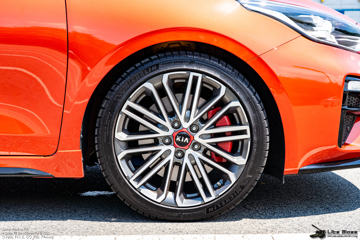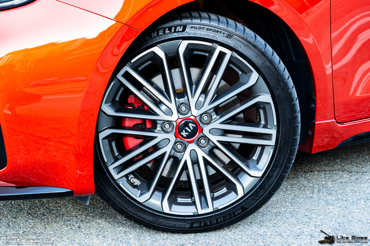타이어는 225/40ZR18 규격으로 올시즌 컴포트 타이어인 금호 마제스티 솔루스 KU50이 K3 GT의 기본 출고 타이어이지만 옵션으로 미쉐린의 맥스 퍼포먼스급 서머 타이어인 파일럿 스포츠 4(이하 'PS4')를 선택할 수 있습니다. 그런데 이 옵션이 고작 25만원입니다. PS4의 가격을 생각하면 사실상 거저 주는 거나 다름없는지라 겨울에 출고하는 게 아닌 이상 PS4를 무조건 고르라고 연구진과 상품기획팀이 무언의 압박을 넣고 있는 셈입니다. 제가 이 차를 3월에 출고한 이유도 PS4를 옵션으로 선택하기 위해서입니다.