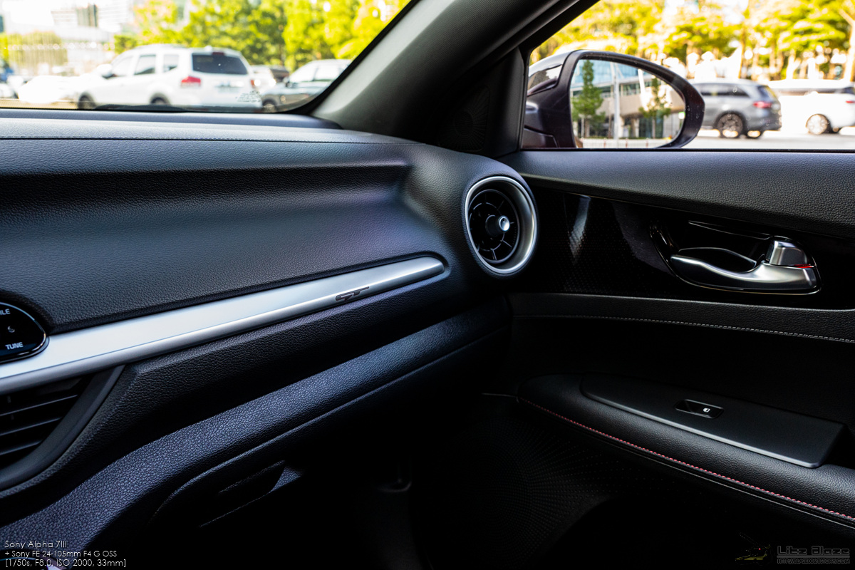 K3는 실내의 은색 장식이 모두 새틴 크롬으로 마감되어 있지만 GT의 경우 크래시패드 가니쉬와 에어벤트 가니쉬는 마감 소재가 메탈릭 페인트로 변경됩니다. 크래시패드 가니쉬는 GT 전용 사양이라 그렇다고 쳐도 에어벤트 가니쉬는 어째서 바꾼 걸까요. 크래시패드 가니쉬와의 깔맞춤?