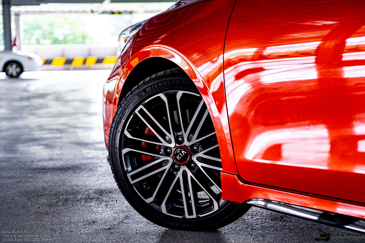 타이어와 매치되는 휠은 GT 전용 18인치 알로이 휠입니다. 기아가 즐겨 사용하는 다이아몬드 커팅 공법을 적용한 전면가공 휠로 허브캡에는 빨간 포인트를 넣었습니다. 이 빨간 허브캡은 나중에 출시된 셀토스도 써먹게 되죠. 잘 빠진 디자인의 휠이긴 한데 스포크가 무려 20개나 되다 보니 세차할 때는 지옥을 선사합니다. 문제라면 대용량 브레이크 세트와 매칭 된 로우스틸 패드가 무지막지한 금속 분진을 뿜어내서 휠이 순식간에 새까매진다는 거죠. 이 차를 타는 차주는 휠 세차의 달인이 되어야 합니다.