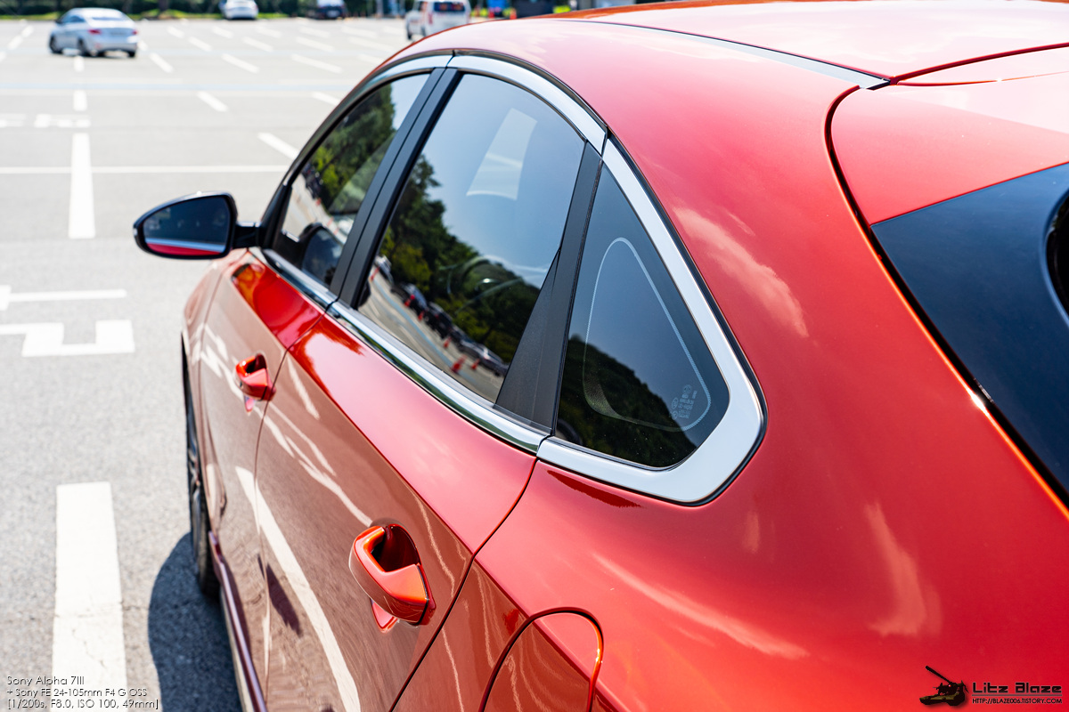 제 차만의 문제인지 K3 GT 5도어 전체의 문제인지는 모르겠지만 쿼터 글라스가 약간 비뚤게 조립되어 있어 특정 각도에서는 윈도우 몰딩에 꽤나 큼직한 단차가 생긴 것을 확인할 수 있습니다. 신차 검수할 당시에는 두꺼운 몰딩 보호커버가 붙어있어 방심했습니다.
