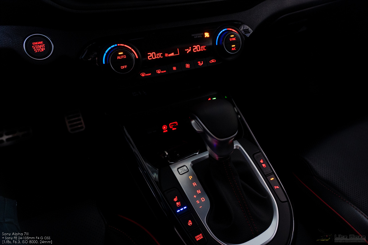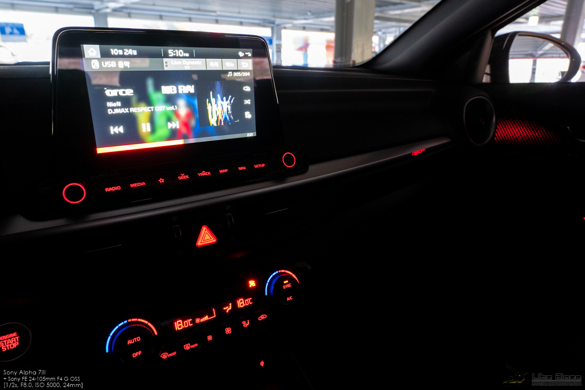 나름대로 기본형 K3와 차별화되는 요소이긴 한데 위의 사진에서 보시다시피 앰비언트 라이트가 적용된 면적이 그리 넓지 않은지라 존재감은 그리 크지 않습니다. 거기에 센터페시아의 백라이트는 앰비언트 라이트의 색상과 관계없이 항상 기아 특유의 레드가 적용되는지라 앰비언트 라이트가 폭넓게 적용된 차량들처럼 실내 분위기를 좌우하지는 못합니다. 제 경우는 센터페시아 백라이트의 연장선 삼아 레드 컬러로 사용합니다.