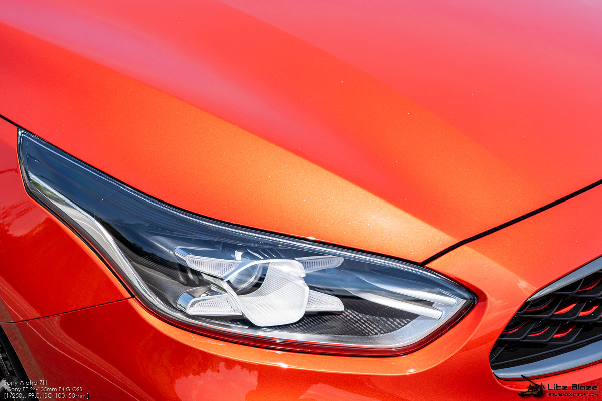 헤드램프는 바이펑션 사양의 2구 LED 프로젝션 헤드램프와 LED 주간주행등이 더해진 구성입니다. 2구 구성임을 감안하면 헤드램프 베젤이 꽤나 넓은 편인데 이는 하위 사양에 적용되는 할로겐 헤드램프가 4구 구성이기 때문입니다. 보통은 4구 구성이 2구 구성보다 상위 취급인 것을 감안하면 꽤나 독특한 구성이죠. 아무튼 베젤이 널널하기 때문에 가니쉬 등의 장식 요소가 꽤나 많이 들어갔는데 의외로 베젤 옆구리에 있을 법한 [KIA LED SYSTEM] 같은 문구는 들어가지 않았습니다.