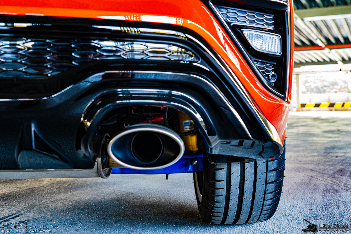 전체적으로 심플하게 다듬은 후면이지만 리어 범퍼는 꽤나 과격한 구성입니다. 리어 스커트를 디퓨저 형태로 구성하고 최근 유행하는 페이크 머플러가 아닌 진짜 듀얼 머플러를 설치하여 이 차가 한 성질 하는 녀석임을 어필합니다. 배기음은 벨로스터 N같은 고성능 팝콘기계는 아니지만 1600cc 소형 엔진 치고는 제법 그르렁거리면서 낮게 깔리는 소리를 만들어내는데 그렇게 부담스럽지 않으면서도 이 차의 성격을 잘 나타내 줍니다.
