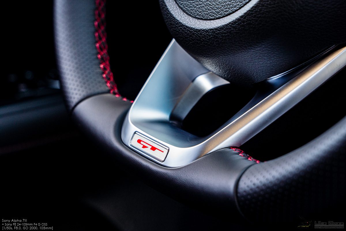 그리고 스포츠 지향 모델의 전매특허인 D컷 스티어링 휠이 적용되어 있습니다. 물론 이 차는 탑승할 때 무릎이 스티어링 휠에 닿을 정도로 레그룸이 극단적으로 좁은 차는 아니지만 간단한 리터치만으로 스포츠 감성을 살리기에는 이만한 물건도 없죠. 6시 방향 스포크는 GT 엠블럼으로 장식했고 스포크 전체를 새틴 크롬으로 마감했습니다. 시트와 마찬가지로 레드 스티치도 적용되어 있지요.