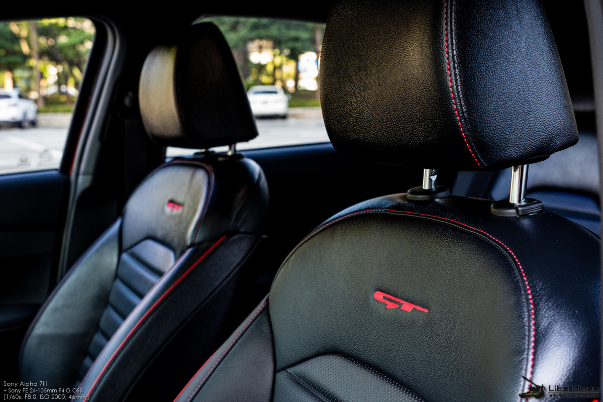 1열 시트에는 레드 스티치로 GT 엠블럼을 그려 넣었고 시트와 헤드레스트의 테두리도 레드 스티치와 레드 파이핑으로 장식했습니다. 지금의 시트도 꽤 잘 어울리지만 이왕이면 2세대 K5의 GT 사양처럼 블랙+레드 투톤 시트를 적용했으면 좀 더 개성이 살아나지 않았을까 싶습니다.