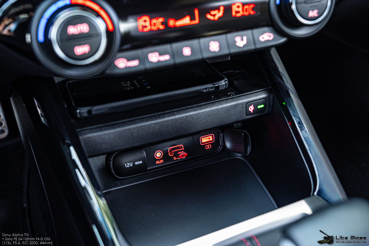 공조장치 패널 하단에는 2단 구성의 수납함이 마련되어 있습니다. 상단 수납함은 무선충전기가 내장되어 Qi 무선충전 규격을 지원하는 휴대폰을 충전할 수 있습니다. 다만 차량용 무선충전기가 대부분 그렇듯 발열 문제에서 자유롭지 못하기 때문에 급속충전은 지원하지 않습니다. 충전 중 발열이 심해질 경우 휴대폰이 식을 때까지 자동으로 충전을 멈추기 때문에 가만히 내버려 두면 충전램프가 켜졌다 꺼졌다를 반복하는 것을 볼 수 있습니다.