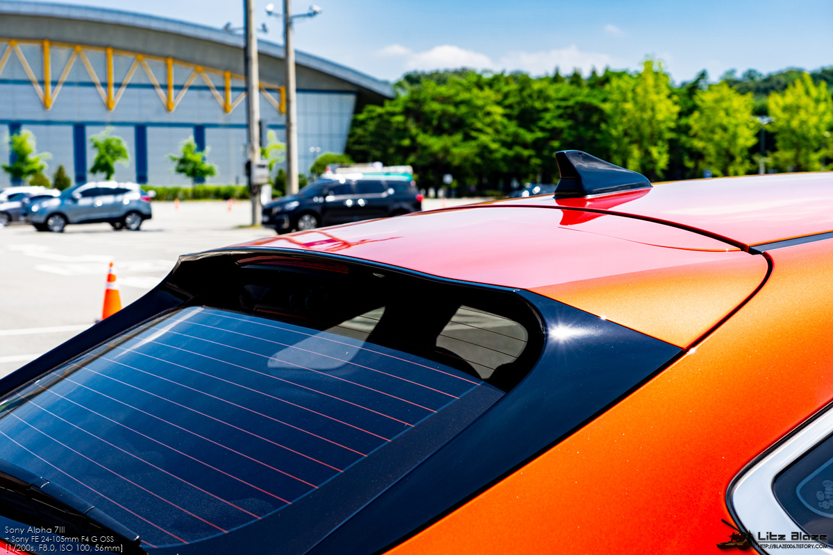 워밍업으로 자동차 쇼룸의 360도 VR마냥 한 바퀴 죽 둘러봤습니다. 빛을 받는 각도에 따라 컬러 톤이 상당히 크게 바뀌는 편인데 일조량에 영향을 크게 받는 유채색 메탈릭 도료임을 감안해도 변화의 폭이 상당한 편입니다. 이 차에 적용된 색상은 기아차 전체를 통틀어 K3 GT에만 사용되는 컬러인 '오렌지 딜라이트'로 제가 이 색상을 고르게 된 데에는 저 위엄 돋는 'GT 전용'이라는 문구에 낚인 탓이 큽니다.