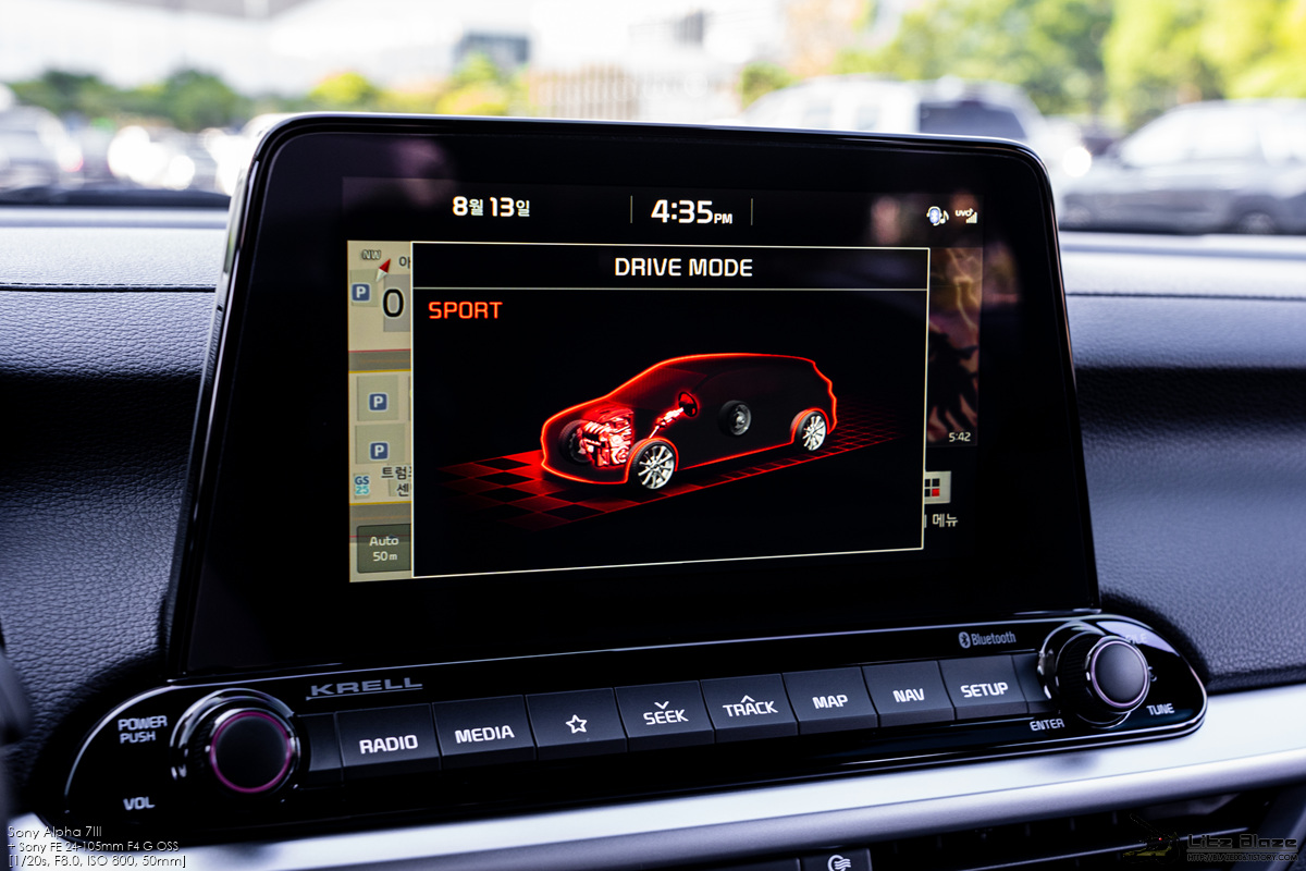 스포츠 모드에 진입하면 가장 먼저 엔진 회전수가 오르면서 그르렁거리는 엔진 사운드가 반겨주는데 사실 스포츠 모드를 켜자마자 거칠어지는 엔진음은 ESG(전자식 사운드 제너레이터)가 만들어내는 가상음입니다. 초기형 ESG는 카오디오의 스피커로 만들어냈지만 K3 GT의 ESG는 와이퍼 박스 아래의 카울 패널에 부착되어 진동을 발생시켜 조금 더 실제 엔진음에 가까운 부가음을 만들어내는 방식입니다. 이 때문에 아주 가끔이지만 ESG의 진동이 다다닥 하고 잡소리를 만들기도 하죠.