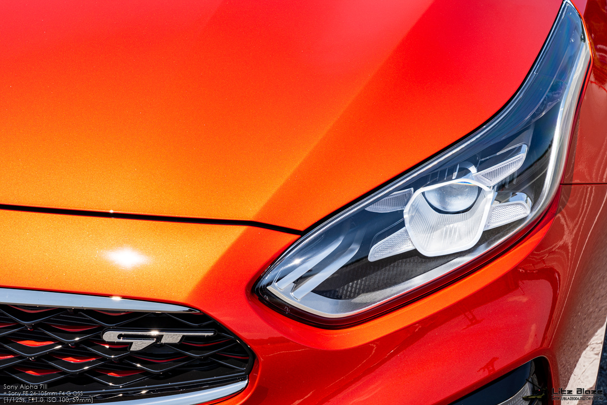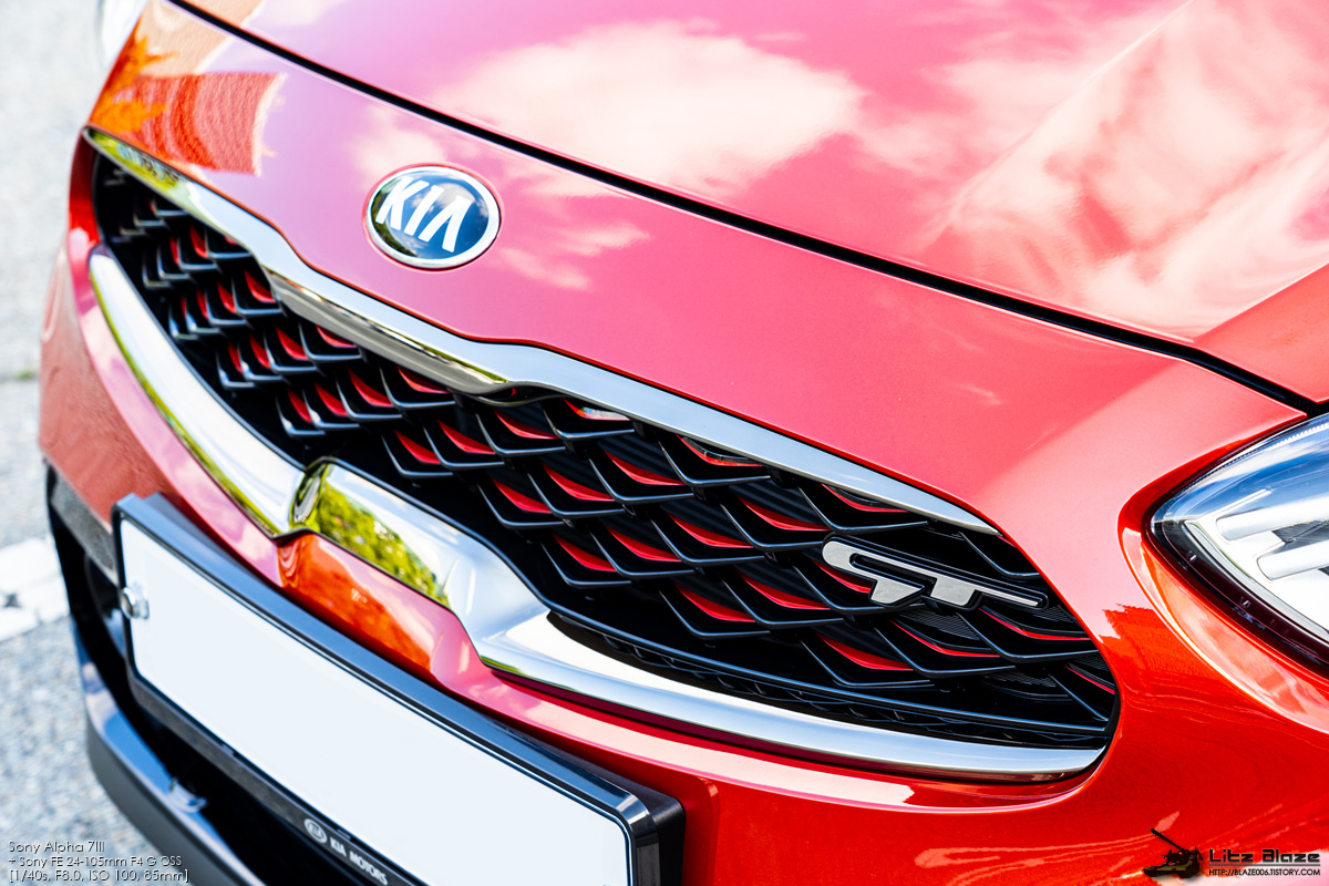 프런트 마스크에서 유일하게 GT임을 어필하는 요소는 라디에이터 그릴입니다. 기아의 패밀리룩인 호랑이코 그릴을 구성하는 크롬 파츠는 다크 크롬으로 교체되었고 그릴 메쉬 내측의 레드 포인트는 도색이나 별도의 인서트 삽입이 아닌 이중사출 플라스틱으로 구현했습니다. 기아차로서는 이중사출 성형을 도입한 첫 사례라고 하는군요. 그리고 GT 엠블럼으로 이상한 차임을 어필하는 화룡정점을 찍습니다. 자고로 라디에이터 그릴에 제조사 엠블럼 말고 다른 거 붙어있는 차들은 이상한 차들입니다.