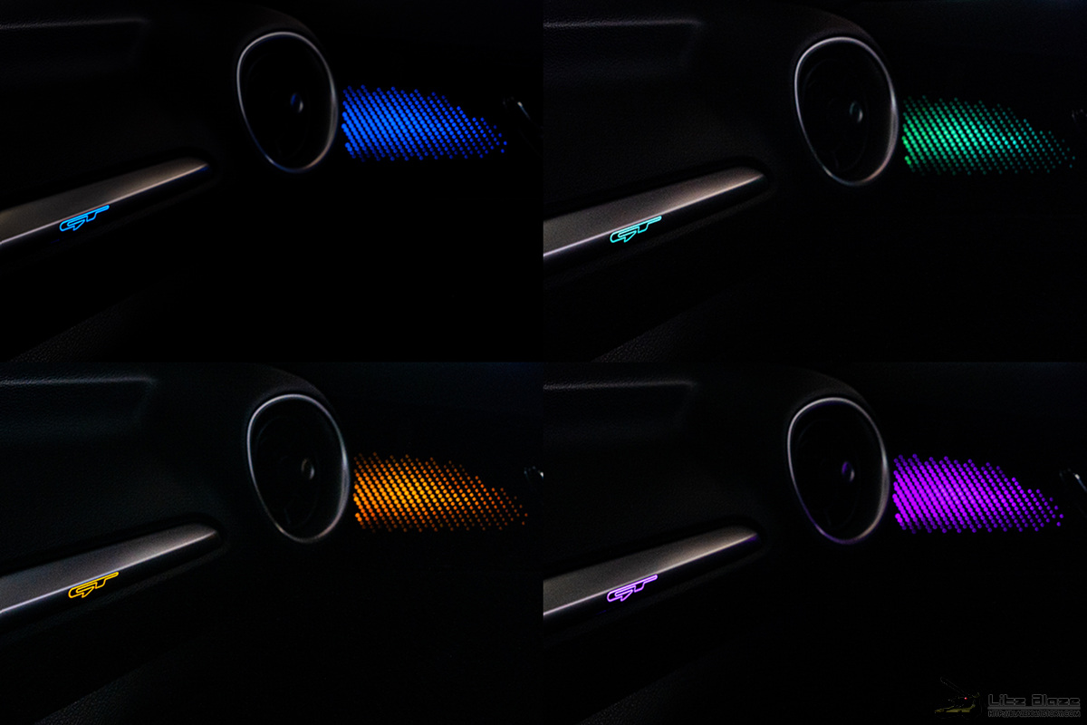 크래시패드 가니쉬의 GT 엠블럼과 사이드 에어벤트 바로 옆의 도어핸들 가니쉬에는 가변형 LED를 사용하는 앰비언트 라이트가 내장되어 있습니다. 국산 C 세그먼트 중에서는 최초로 앰비언트 라이트를 적용한 사례죠. 사진에 나온 파랑, 초록, 주황, 보라 4가지의 색상 외에도 빨강, 하양을 포함하여 총 6색으로 작동하며 드라이브 모드 변경에 따라 연동시킬 수도 있는데 이 때의 색상은 각 모드의 상징 색상이 됩니다.