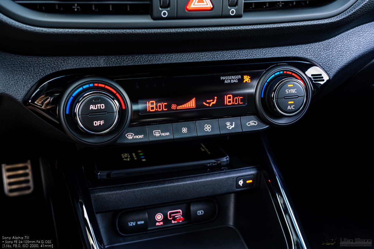 공조장치는 듀얼 오토 에어컨이 적용됩니다. 몇몇 차종의 경우 인포테인먼트 디스플레이에 공조장치 정보를 표시하는데 K3는 별도의 세그먼트 디스플레이를 적용하여 편의성을 좀 더 챙겼습니다. 공기청정 기능을 지원하는데 작동 버튼에 별도의 아이콘이 표시되지 않아 사용설명서를 읽어보지 않으면 공기청정 기능이 있다는 것을 모르고 넘어갈 수 있습니다.